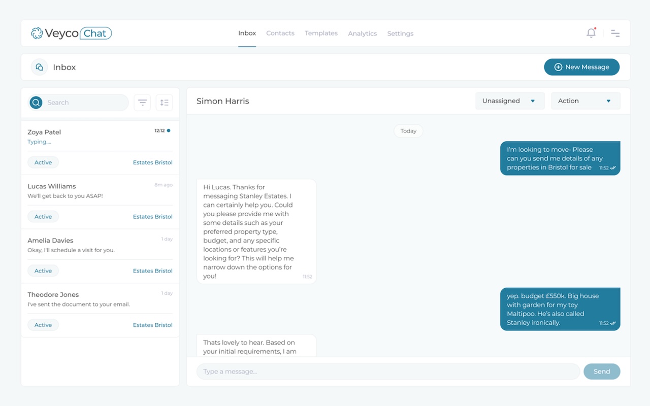 Veyco Chat is a purpose-built communication platform for estate agents, and property professionals, combining the immediacy of WhatsApp messaging with intelligent AI-powered voice support. It enables businesses to manage customer conversations seamlessly across channels, respond faster, and never miss an enquiry thanks to built-in AI telephone answering.